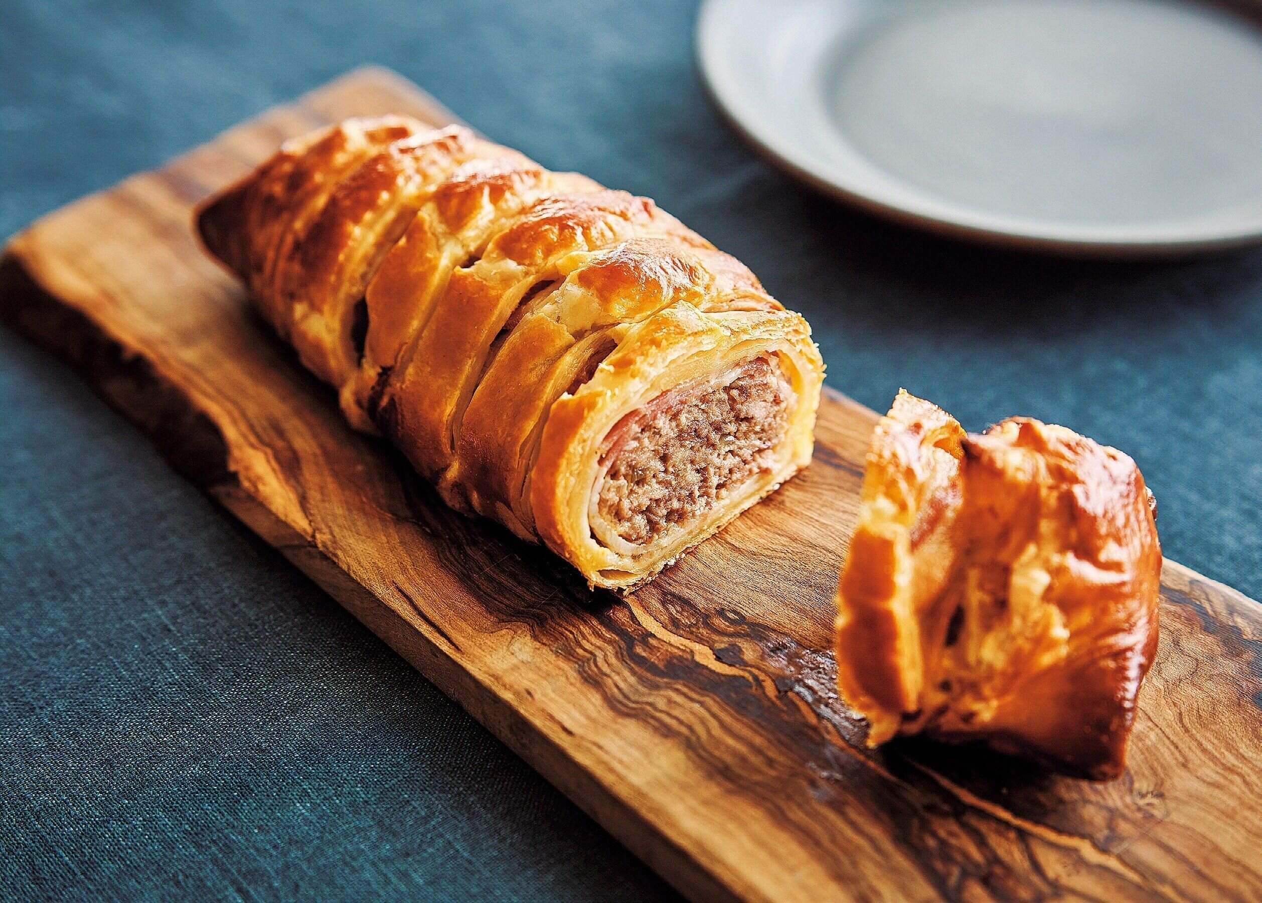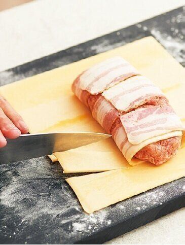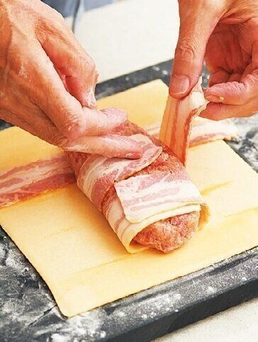 (1)まな板にパイシートを広げ、表面に溶き卵を塗る。上下を3cmずつ空けてベーコンを横長にのせる。肉だねを厚さ約3cmの長方形にしてのせ、べーコンで巻く。