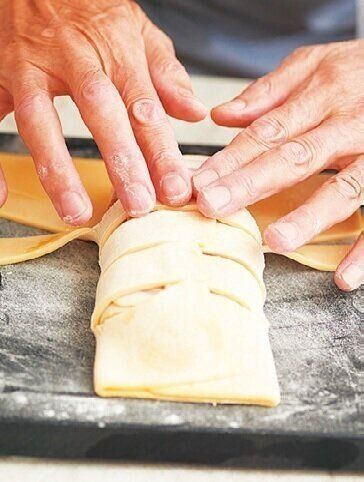 (2)肉だねの左右のパイシートに、1.5cm間隔で斜めに切り込みを入れる。