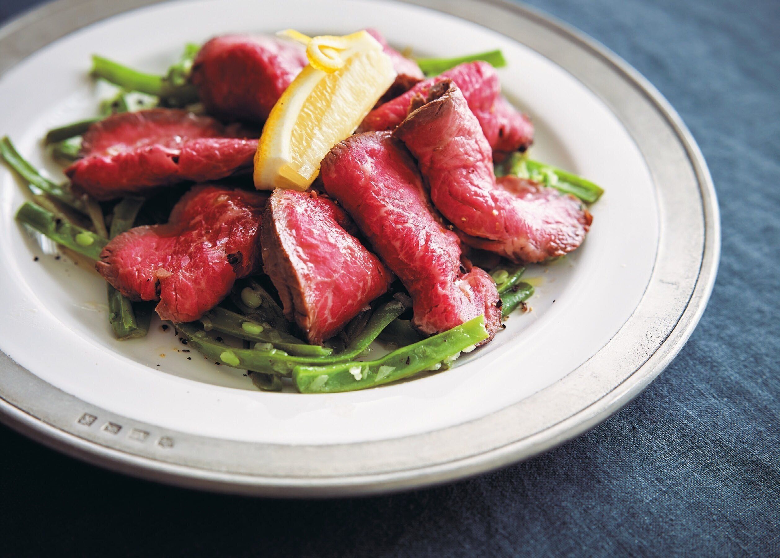 (3)器に、あればサラダを敷いてローストビーフを盛り、レモンとマスタードを添える。