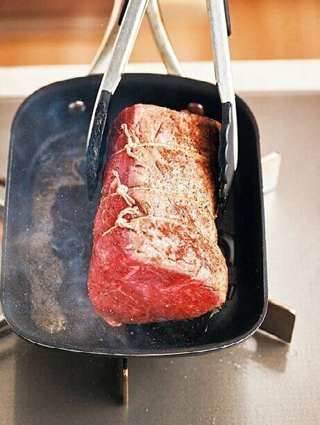(1)牛肉は塩大さじ1、こしょう少々をすり込み、たこ糸で3カ所結ぶ。卵焼き器(またはフライパン)にサラダ油を強火で熱し、牛肉の表面を軽く焼いて取り出す。