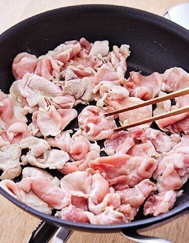 フライパンにオリーブ油とにんにくを入れ、中火にかける。香りが立ったら豚肉を入れ、焼き目がついたらしょうゆを加えてからめる。