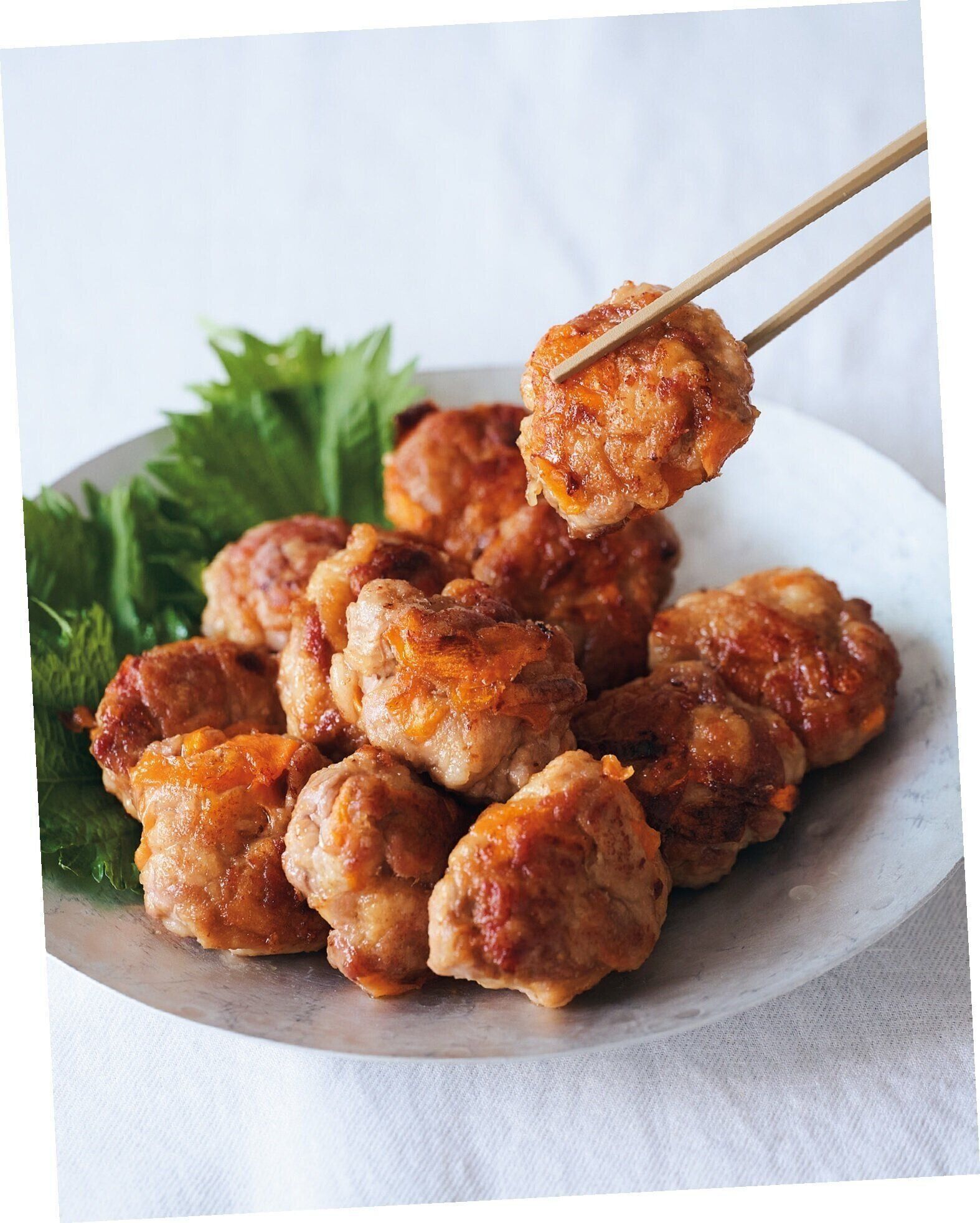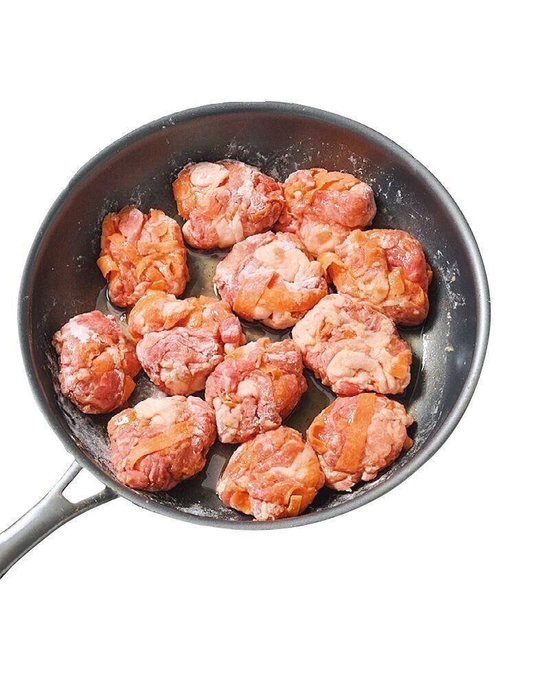 片栗粉大さじ1を混ぜ、12等分してにんじんと肉を丸め、表面に片栗粉大さじ1 1/2をまぶす。油を回し入れて中火で熱し、ひっくり返しながら6~7分こんがりと揚げ焼きにする。