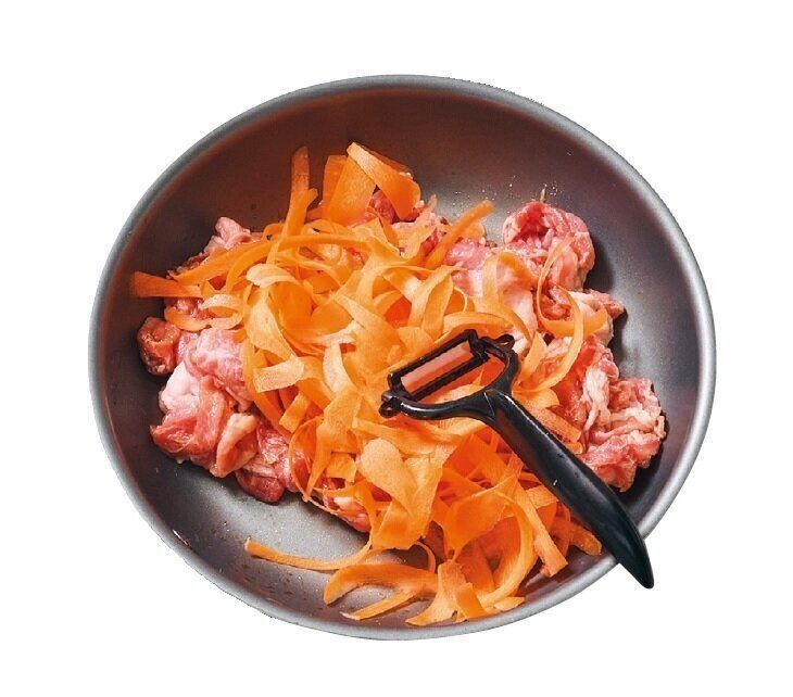 (2)包丁、まな板を使わずにんじんはピーラーで引く