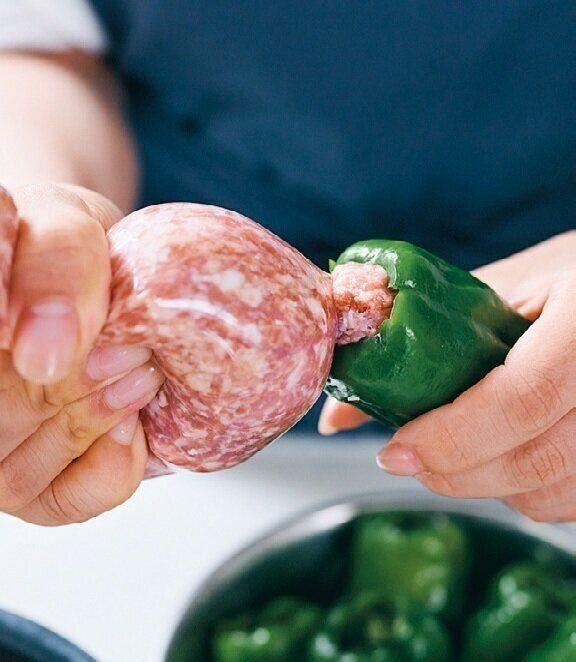ピーマンはへたを指で押して種と一緒に抜き取り、(2)のスライスチーズを詰める。肉だねは、ポリ袋の一方の角を1cm切り落とし、1/8量ずつピーマンに絞り入れる。