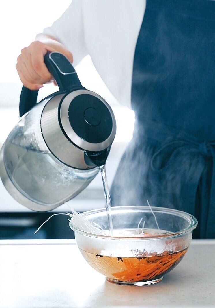 「猛暑のキッチンでお湯を沸かすなんてとんでもない!」から生まれた、熱湯調理ワザ。「乾物や野菜に熱湯をかけて、放置後は味つけするだけ。キッチンの温度も上げません!」。