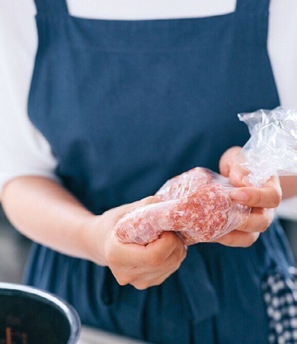 ピーマンの肉詰めを作る。ポリ袋にひき肉、[B]を入れ、ポリ袋ごともみ込む。スライスチーズは半分にちぎって丸める。