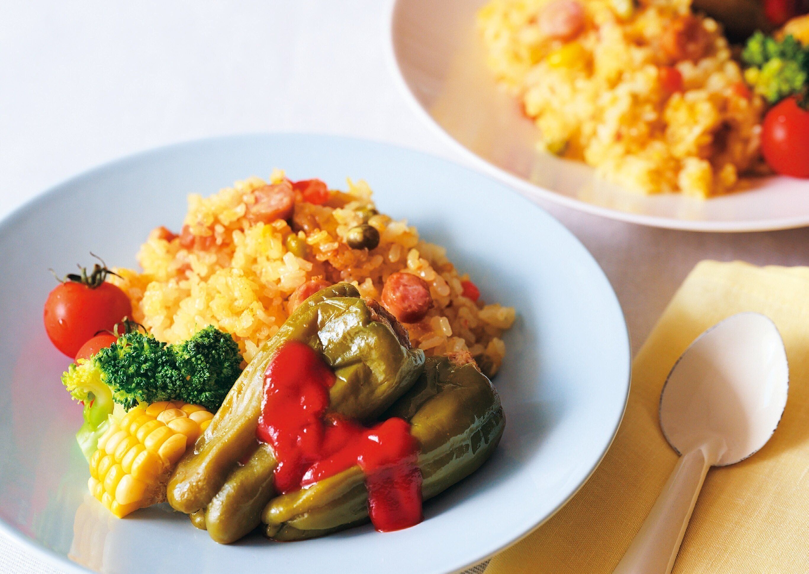 (1)に(3)をのせ、空いた所にとうもろこしをのせて普通に炊く。炊けたらとうもろこし、ピーマンの肉詰めを取り出し、ピラフを混ぜて器に盛り合わせ、好みでピーマンの肉詰めにケチャップをかける。