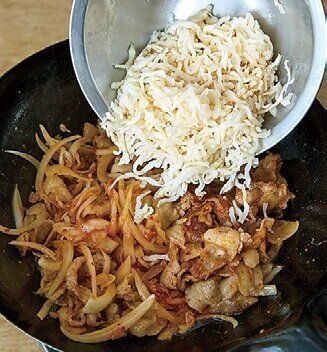 フライパンにごま油を入れて中火で熱し、豚肉を入れて表面に焼き目がつくまで炒め、キムチを加えて炒める。玉ねぎを加えてさっと炒め、切り干し大根を加え、玉ねぎが軽く透き通るまで炒める。