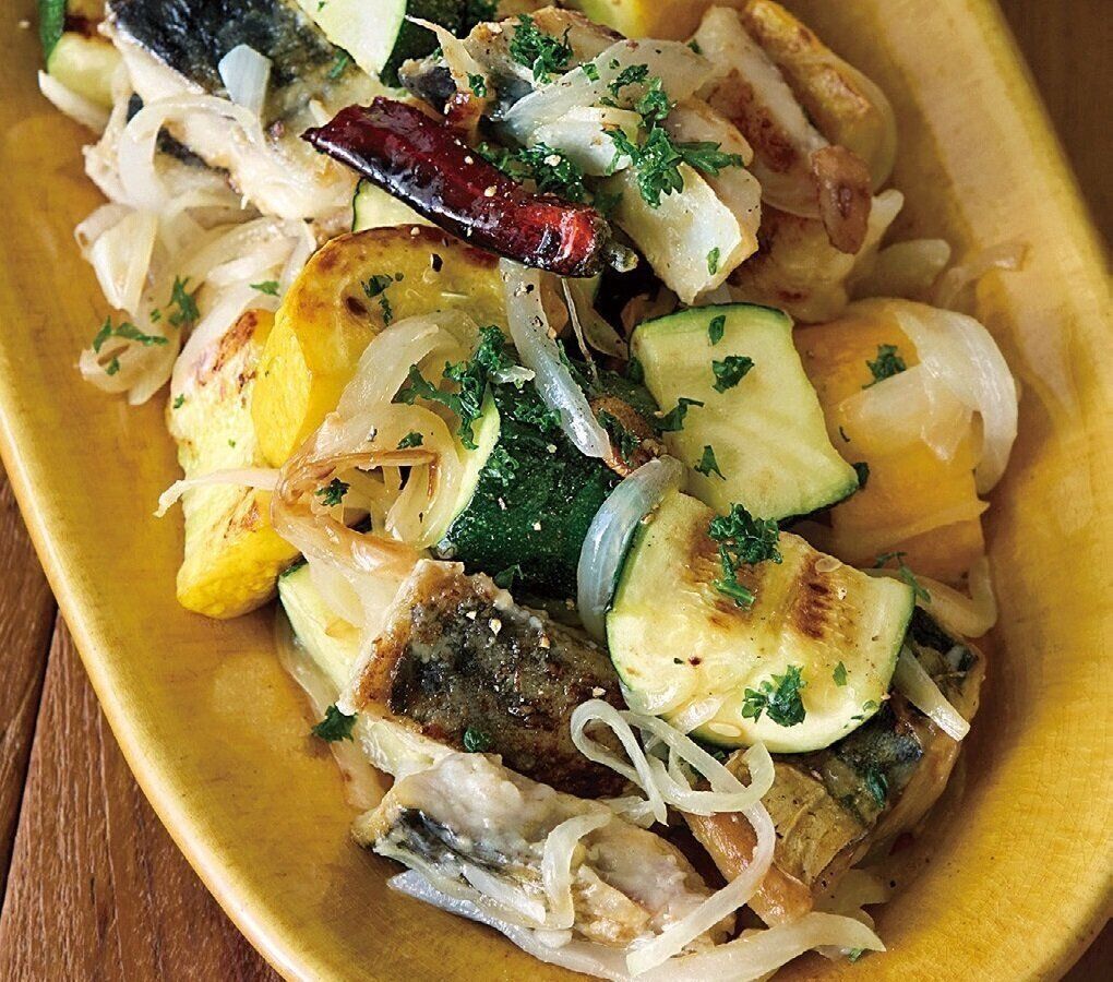 フライパンに、にんにく、赤唐辛子、オリーブ油を入れて弱火にかけ、しっかりとオリーブ油ににんにくの香りがついたら中火にする。塩さば、玉ねぎ、ズッキーニを入れ、全体を返しながら焼き色がついてカリッとするまで焼き、塩小さじ2/3をふる。器に盛り、パセリのみじん切り、黒こしょう少々をふる。