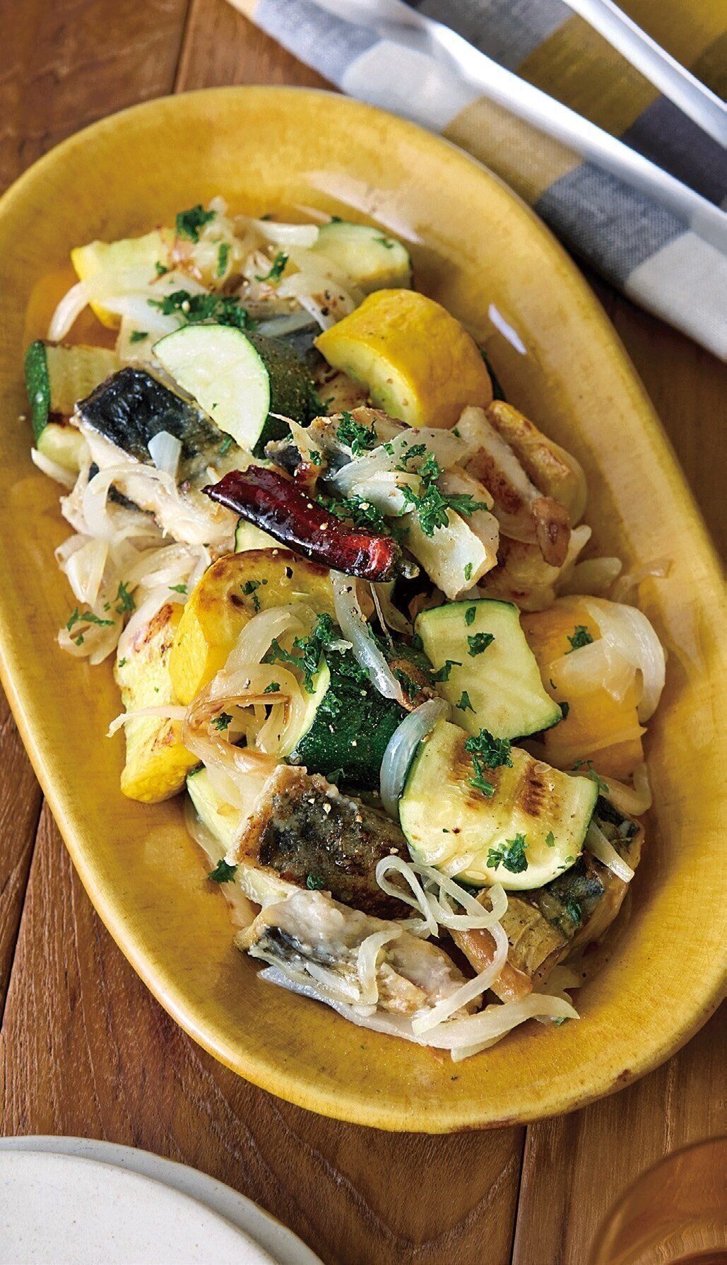 塩さばは幅2cmに切り、薄力粉をまぶす。ズッキーニは厚さ2cmの半月切りにする。玉ねぎは縦に薄切りにする。