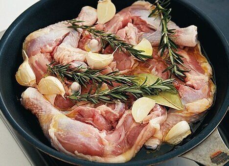 フライパンにオリーブ油を入れ、(1)を皮目を下にして並べる。皮つきのまま半分に切ったにんにく、ハーブをのせて強火にかける。油がフツフツしてきたら弱めの中火にし、20分ほど揚げ焼きにする。