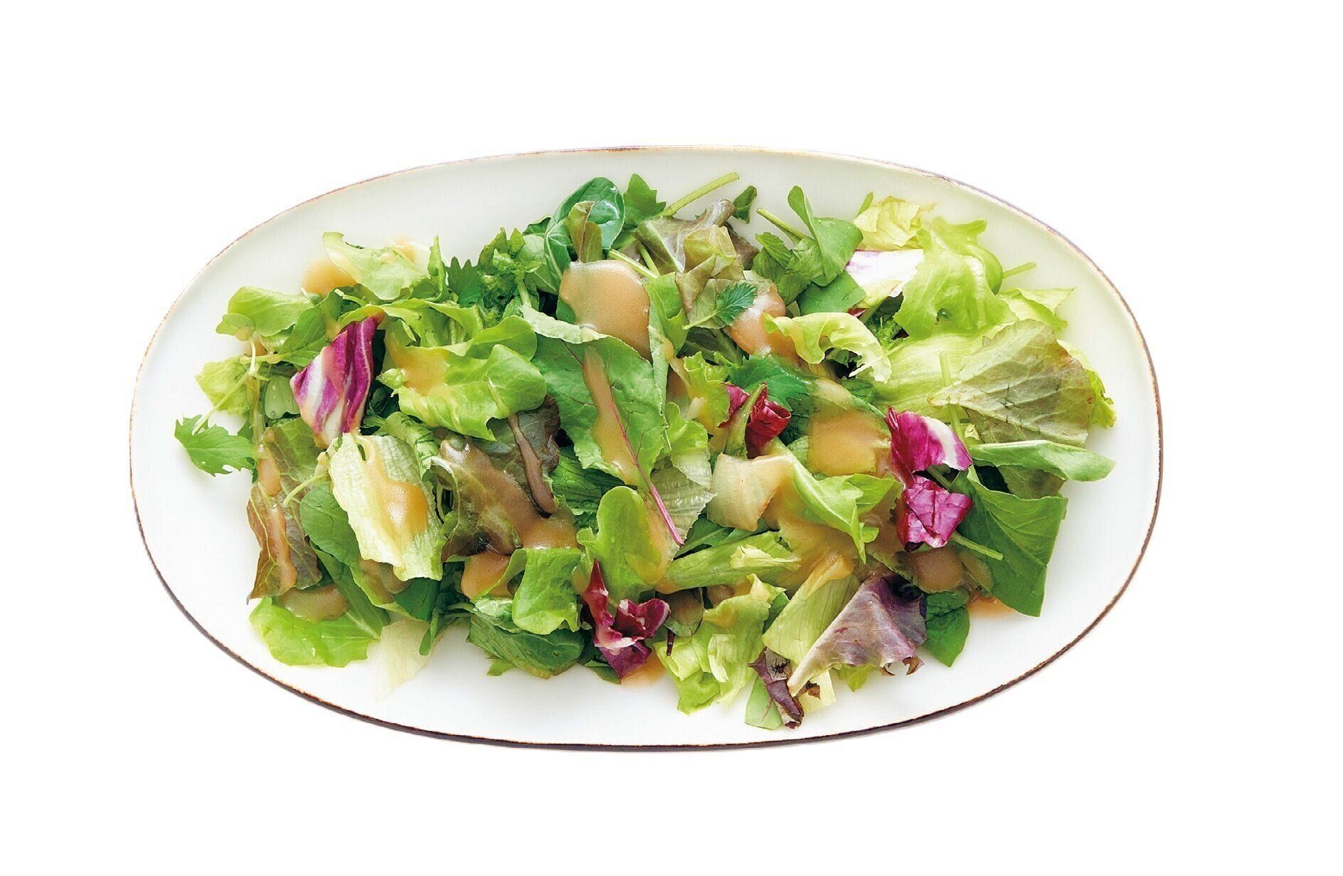 ベビーリーフ、ちぎったレタス各適量を盛り合わせ、フォロのドレッシングを好きなだけかける。