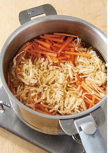 切り干し大根は長いものは食べやすい長さにはさみで切ってさっと洗い、鍋に入れる。にんじんはせん切りにして同じ鍋に入れ、水650mlを入れて5分おく。