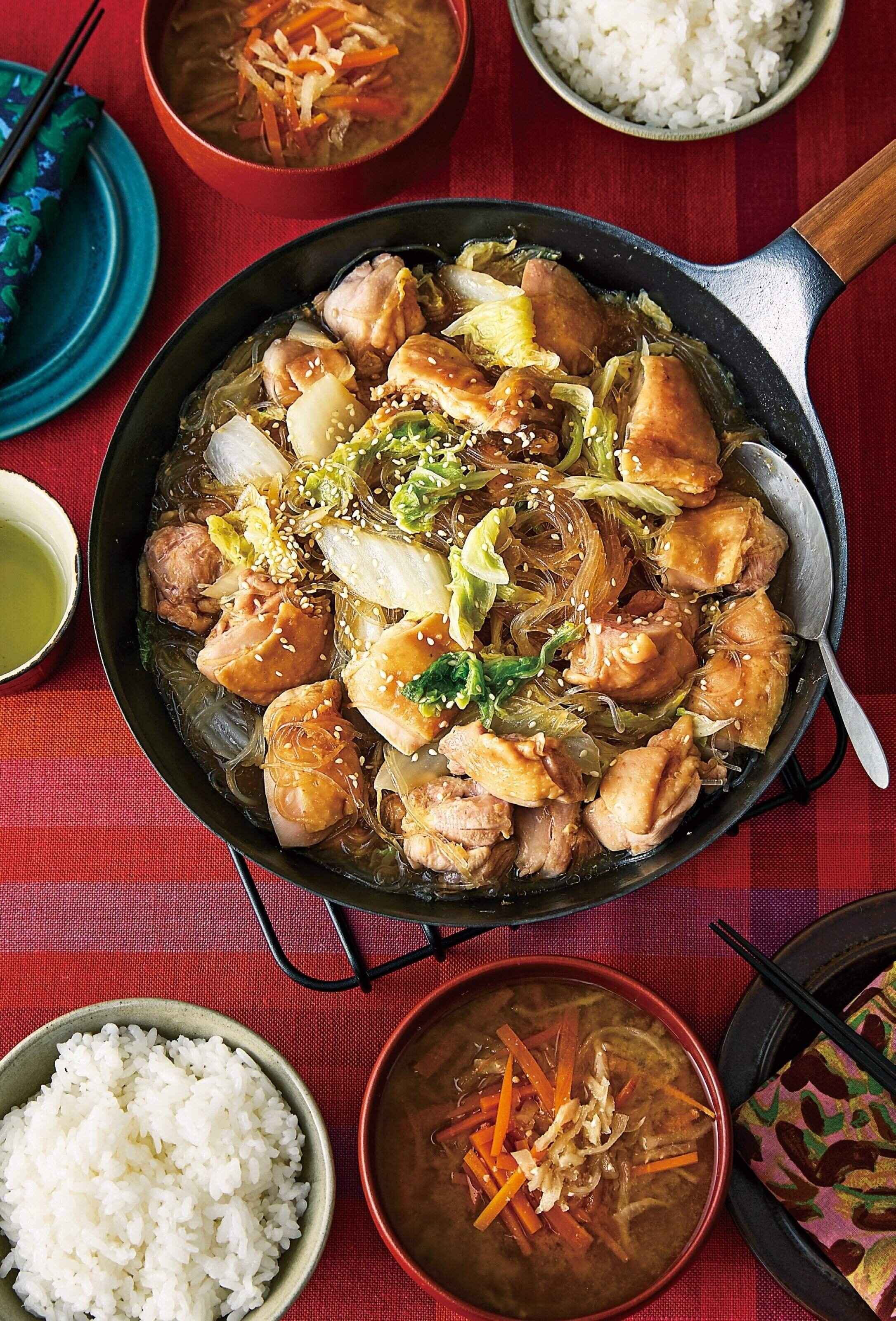 鶏肉と白菜と春雨の重ね蒸しは、ほったらかしでできるのが◎。春雨をもどして、鶏肉に調味料をもみ込み、野菜を切って、フライパンと鍋に材料を入れて。下ごしらえがすんだら、ほぼでき上がりを待つだけ!みそ汁のみそを溶いたら完成です!