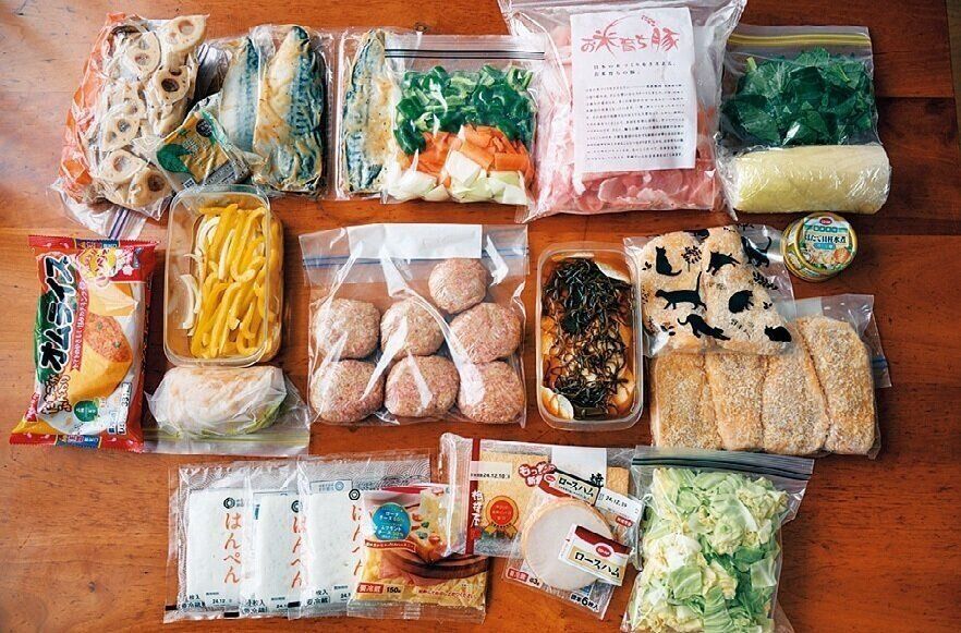 ハンバーグは丸め、とんカツはころもをつけ、野菜は料理に合わせて切って冷凍室へ。煮物や炒め物の野菜は、短時間で火が通るように薄く小さめにカット。厚揚げやはんぺんなど、当日切るものはパックのまま冷蔵。