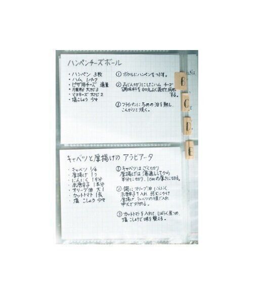 夫が先に帰宅したときにごはん作りを手伝えるよう、メニューと作り方をまとめたオリジナルのレシピ帳を冷蔵室の横にセット。妻が帰宅したらバトンタッチして特急で仕上げます。