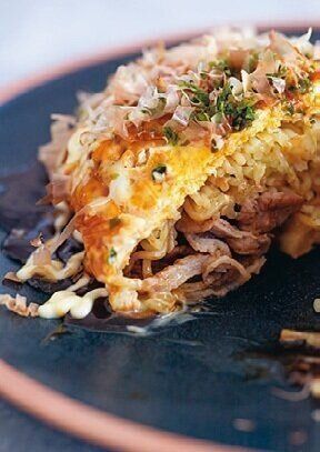 (1)耐熱平皿にラップを大きめに敷き、卵2個を割って溶く。その上にせん切りキャベツ1~2枚分、焼きそば1個(袋の口を1か所切り、耐熱皿にのせて電子レンジで約1分加熱してほぐしておく)、添付のソース少々、豚こま切れ肉50gをのせる。 (2)上にラップを掛けて、電子レンジで6分加熱する(肉に火が通っていなければ再加熱)。ラップを取って半分に折りたたみ、お好み焼きソース、マヨネーズ、青のり、かつお節各適量をかける。