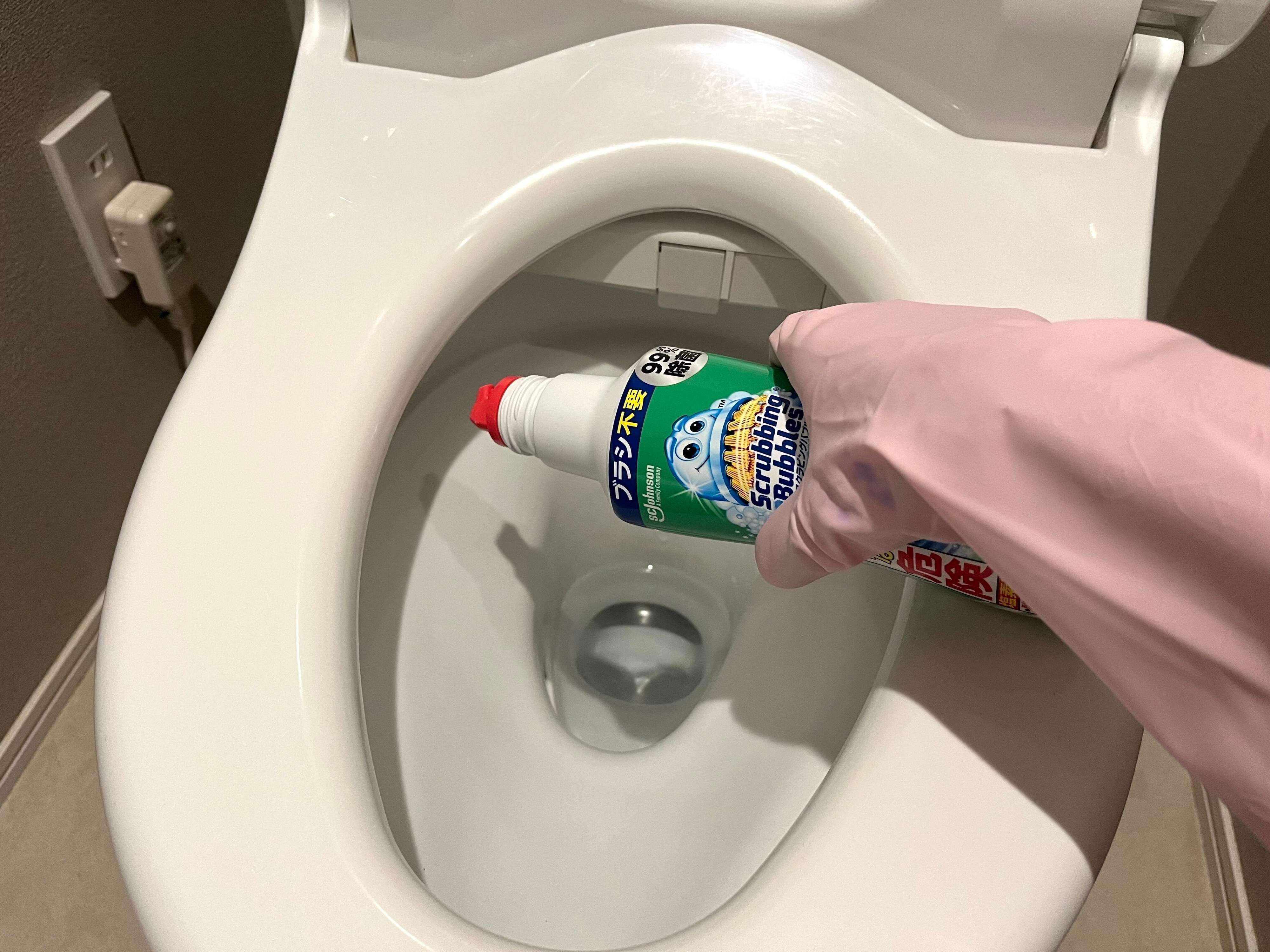 週一のスペシャルケアにおすすめなのが、スクラビングバブルの超強力トイレクリーナー。水垢の黒ずみや便器裏の汚れにかけて放置して流すだけのラクラク掃除アイテムです。