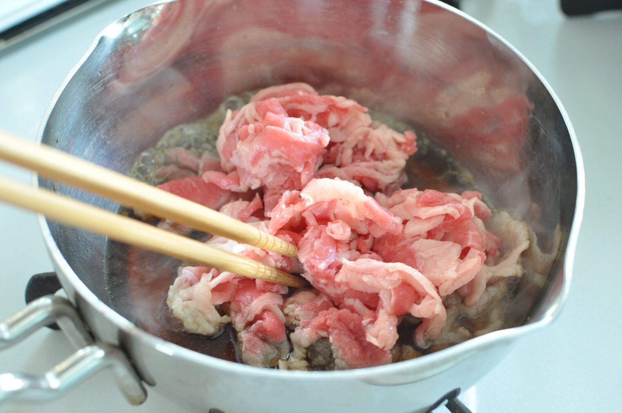 煮立ったら、食べやすい大きさに切った牛肉を加えて、2~3分やや強火で煮ます。