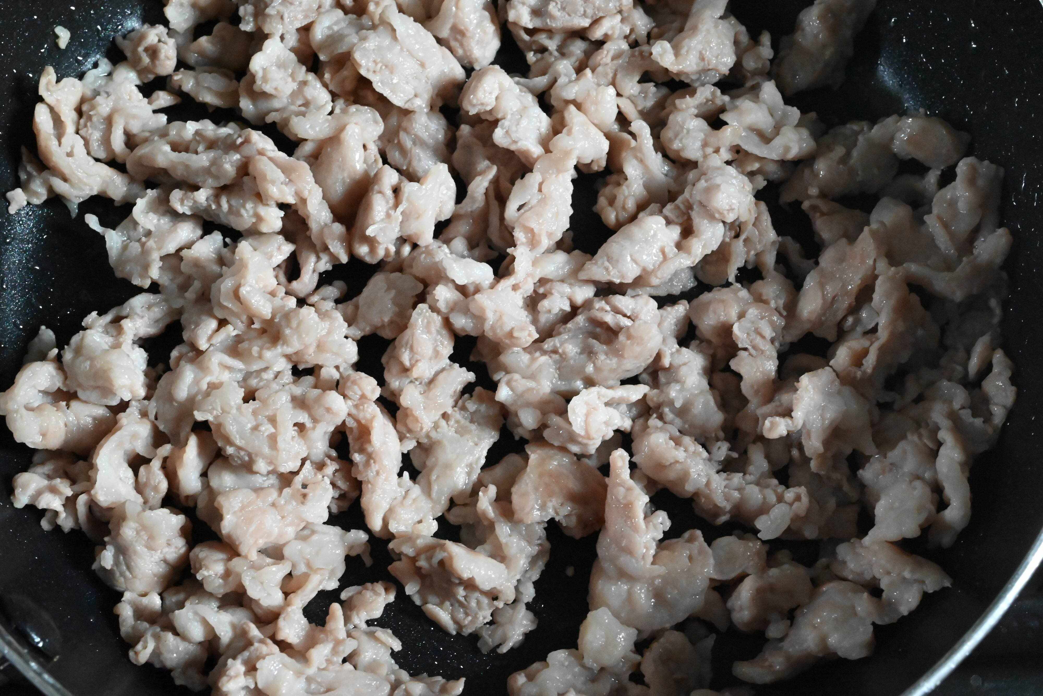 (1)豚バラ薄切り肉を1cm幅に切り、色が変わるまで中火で炒める。