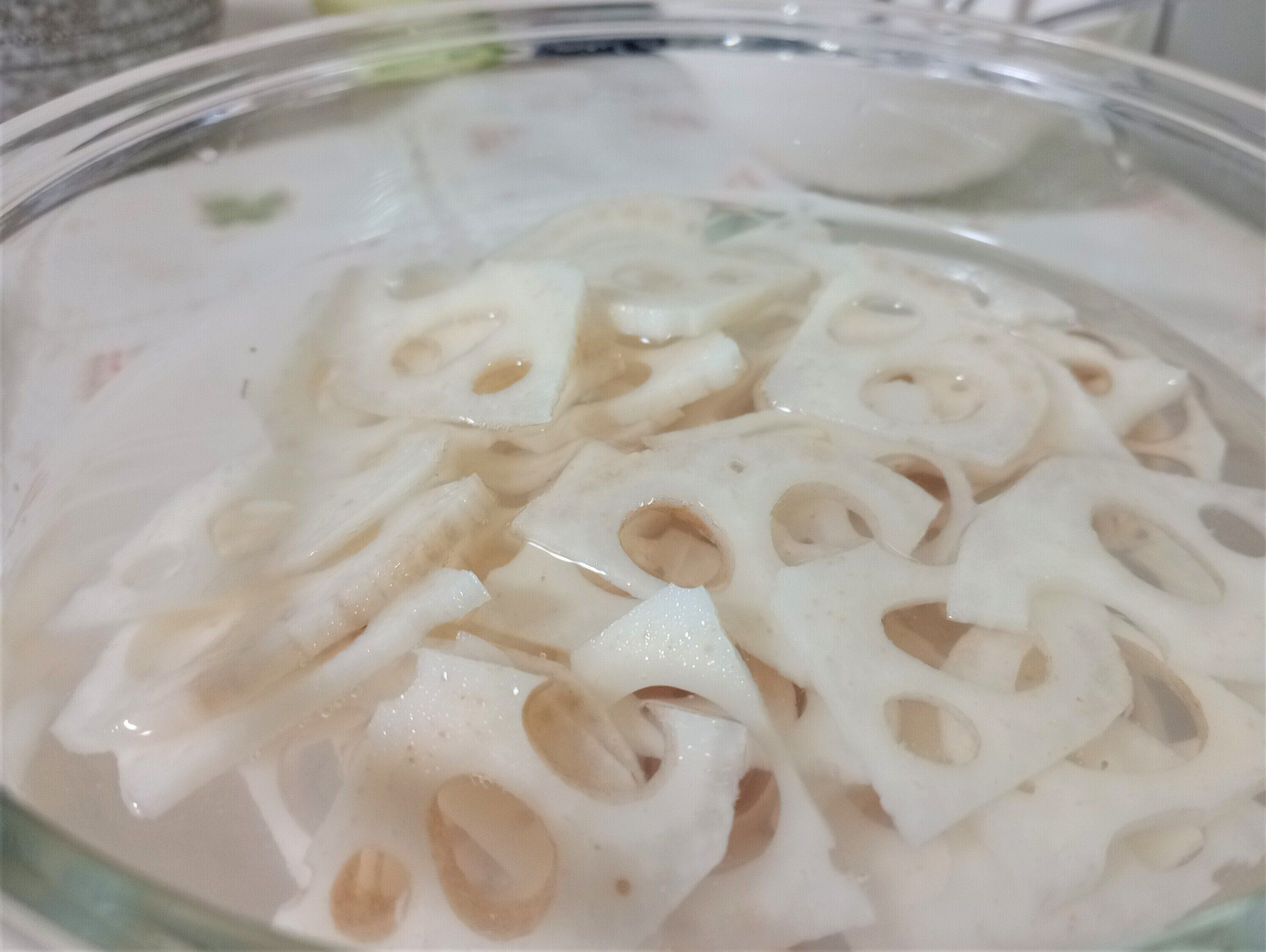 れんこんを切ると空気に触れたところから順に黒ずんでしまうので、それを防止するために水や酢水につける必要があります。