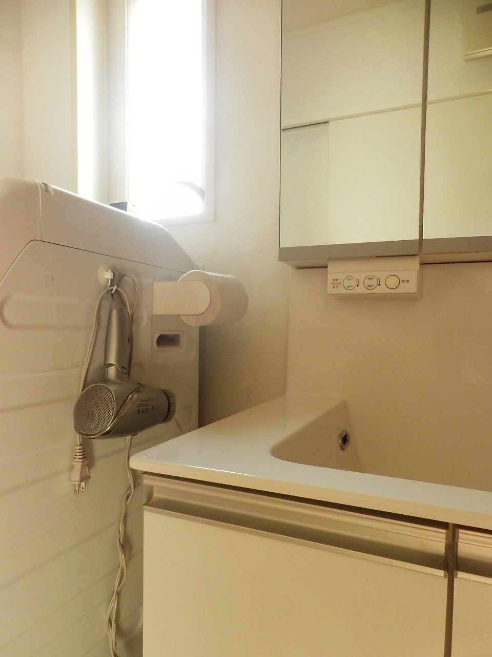 キッチンペーパー用のマグネットで洗面所にかけられているのは、トイレットペーパー。ちぎって使えるため掃除に使いやすく経済的だそうです!