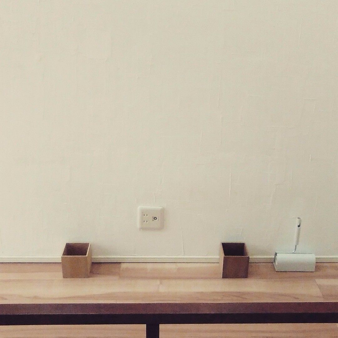 ソファの後ろに置かれた小箱たち。ソファと壁の間にこうして空間がうまれることで壁が汚れない上に、その隙間にソファ専用の390円のコロコロを。気づいた時の掃除が大切です。