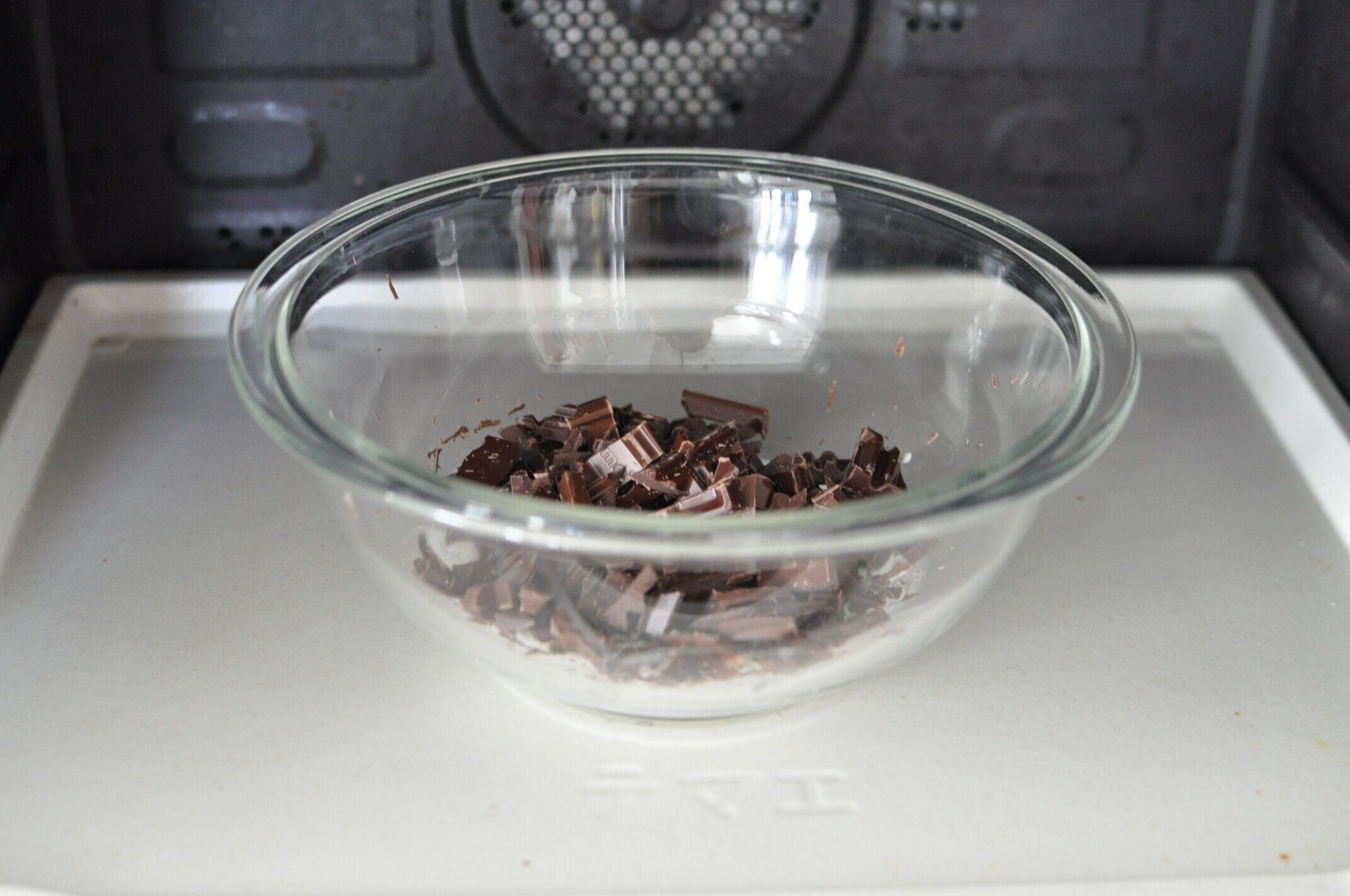 耐熱ボウルに、生クリームと刻んだチョコを入れて、電子レンジ600Wで50秒~1分加熱します。