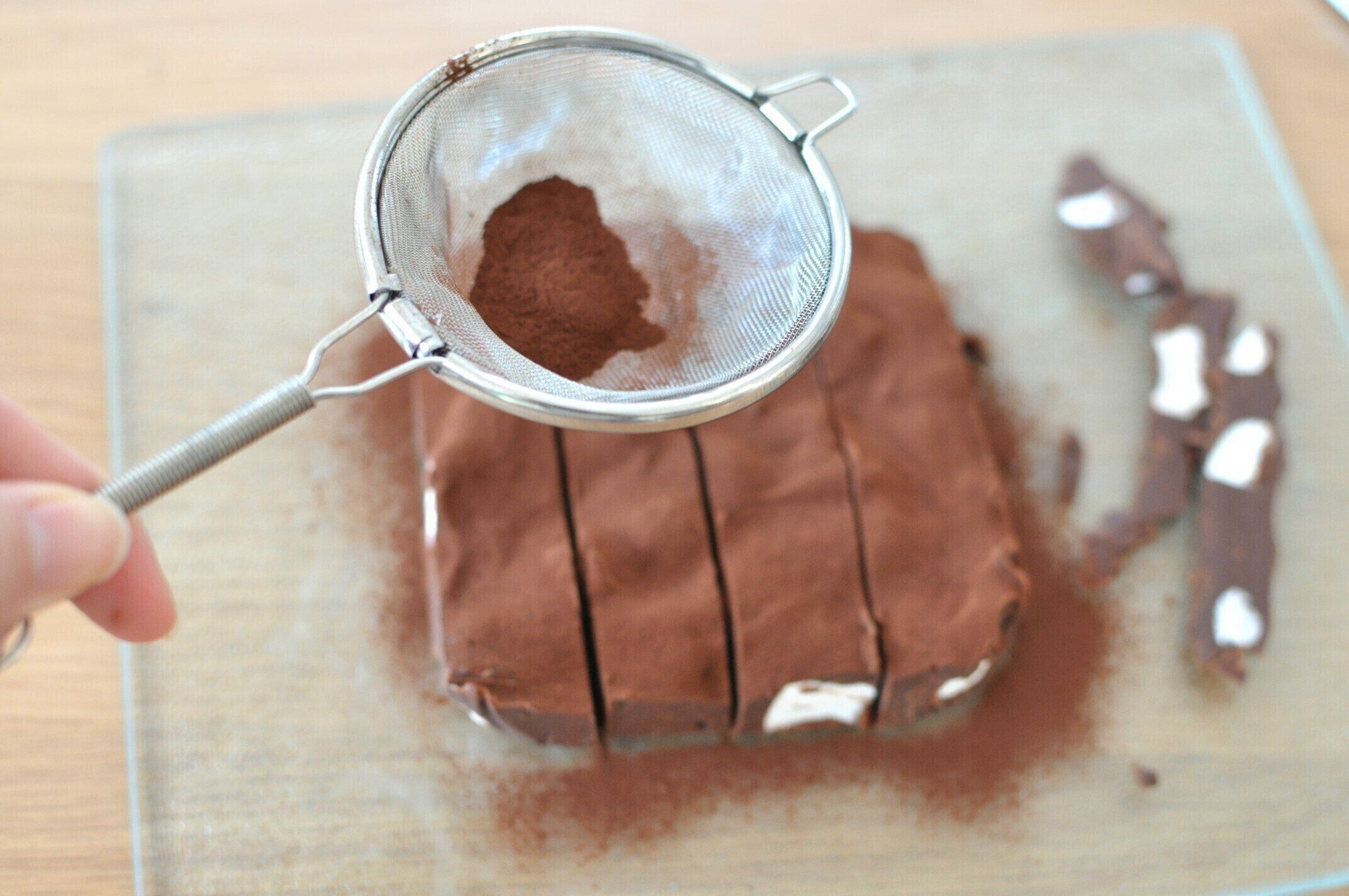 ココアパウダーをふると出来上がりが綺麗。無糖のココアパウダーがあれば、ぜひ振って仕上げてください~!