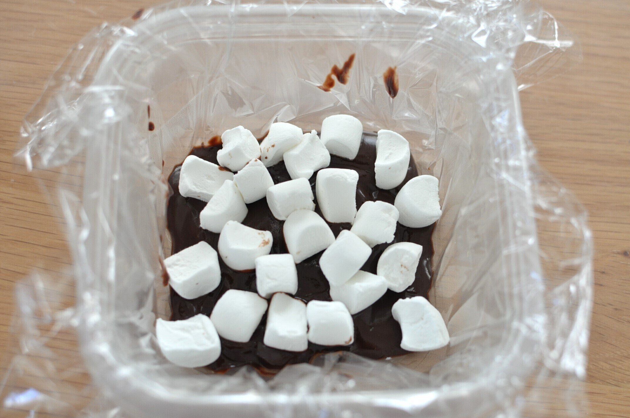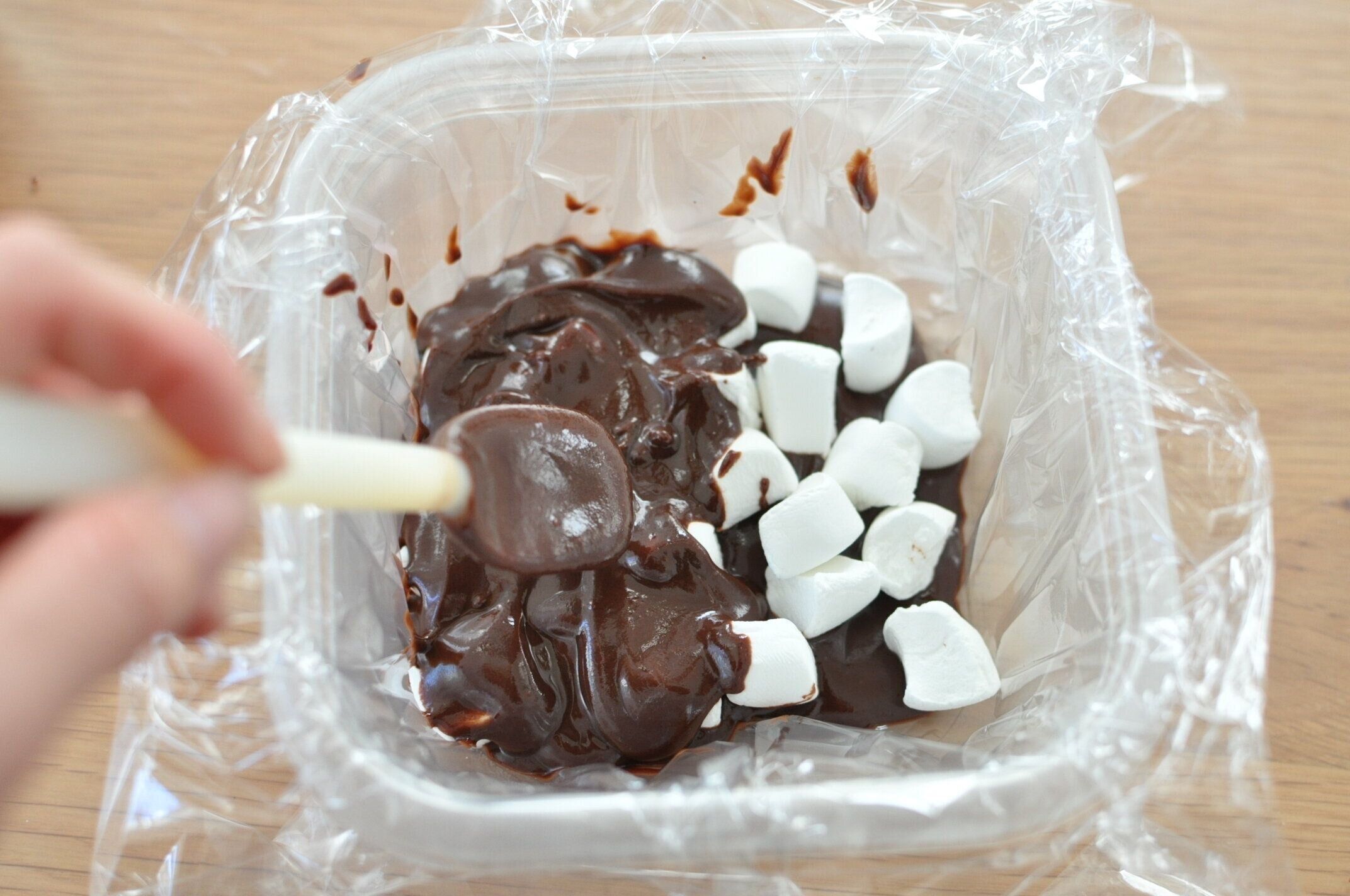 残りのチョコを流し入れます。マシュマロの間にもチョコを入れて、頭が出ないように滑らかに平らに広げます。