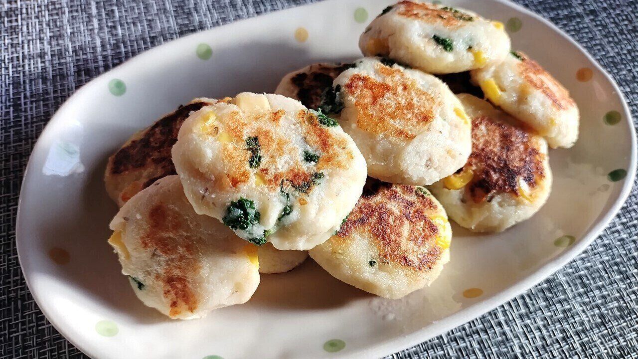 2. ピザ用チーズ、刻んだパセリ、コーンを加え、10等分にして小判型に整える。