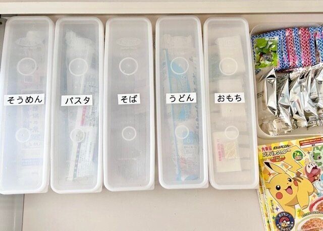 具体的には「うどん・そば・パスタ・そうめん・お餅」といった主食の食材を、100均のパスタ容器に入れて並べて収納するだけ。