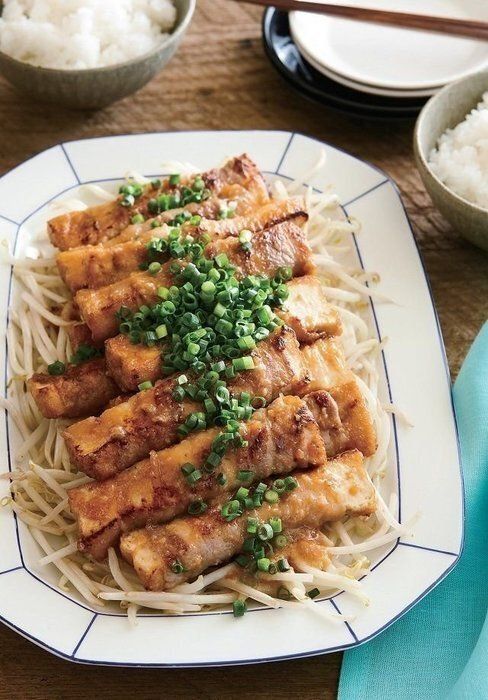 豚バラ薄切り肉には、厚揚げを巻いてかさ増しを。炒めたもやしを添えて、万能ねぎを散らせば食べ応えもバッチリ!ご飯がもりもり進みます。
