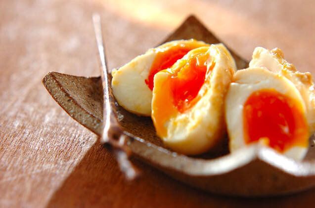 半熟卵を合わせみそに漬けた、半熟卵のみそ漬け。みその濃厚な味わいと、ねっとりとした黄身のうま味がクセになります。卵の向きを少しずつ変えながら漬けることが、全体にムラなく味をつけるポイントです。