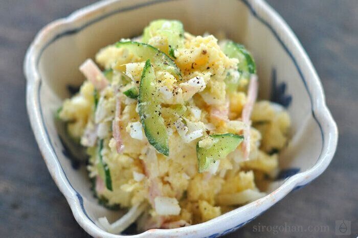 子どもから大人まで大好きなポテトサラダの基本レシピです。冷蔵で3日ほど日持ちするので、まとめてつくっておくと役立ちます。好みでニンジンやグリンピース、ベーコンなどの具材を追加しても◎。