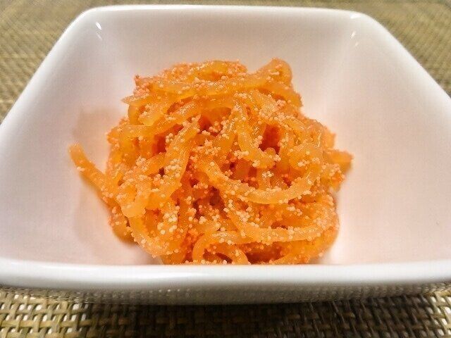 5分でつくれる大根のナムルは、作り置きにピッタリの一品。お酢を使っているためさっぱりと食べることができ、箸休めにピッタリ。シャキシャキの大根の食感も楽しめます。調味料は砂糖が溶けるまでしっかり混ぜると◎。