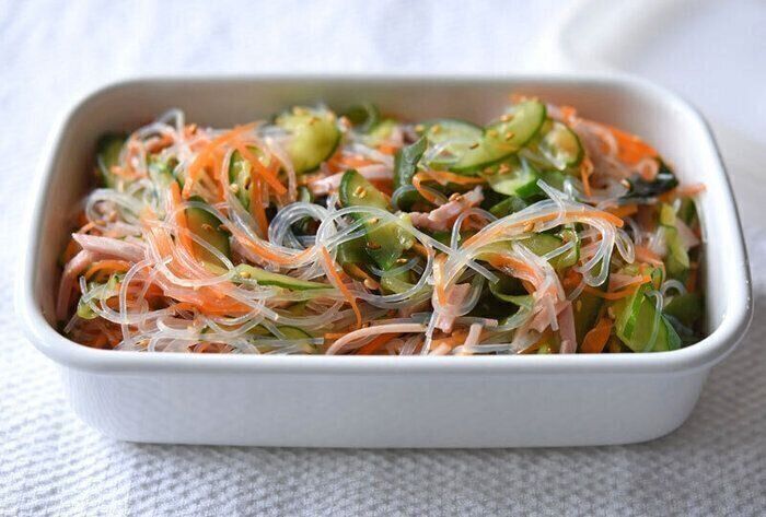 にんじんやきゅうりの彩りが鮮やかで、食卓を華やかにしてくれる春雨サラダ。ごまの風味でアクセントをプラスした、和風の味つけです。仕上がりが水っぽくならないように、水気をしっかり切るのがポイント。