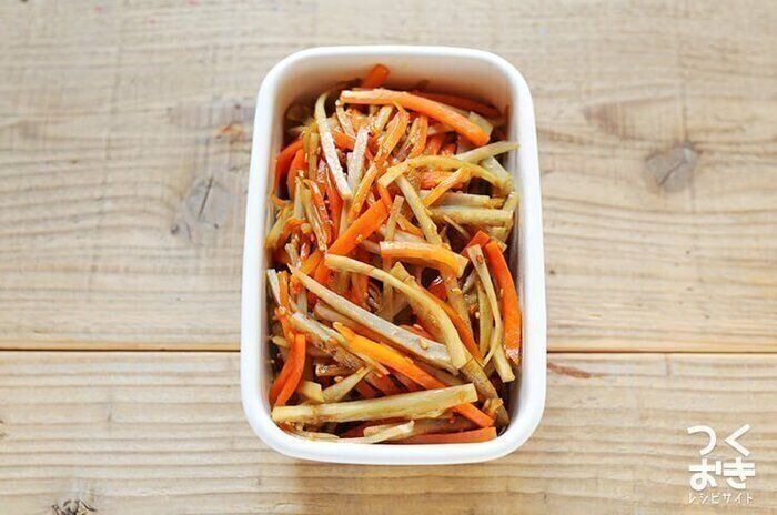 和食の定番おかずのひとつ、きんぴらごぼう。にんじんとごぼうのポリポリとした食感がクセになり、ご飯の進む一品です。小分けにして冷凍保存すれば、お弁当にも便利そうですね。