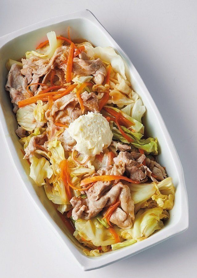 (1)耐熱の器に、キャベツ、にんじんを入れ、豚肉を広げてのせる。