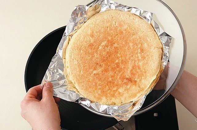 フライパンに、基本の生地を平らに広げる。ふたをしてごく弱火にかけ、5~8分焼く。