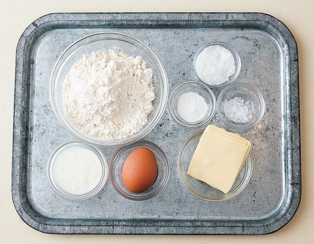 ボウルに、薄力粉、ベーキングパウダーをざるなどでふるい入れ、塩、砂糖を加えて混ぜる。