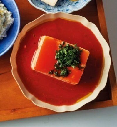 絹ごし豆腐1丁を半分に切って1切れずつ器に盛る。トマトジュース200ml、オリーブ油大さじ1、塩小さじ1/2、おろしにんにく小さじ1/2を混ぜてかけ、パセリのみじん切り適量を散らす。