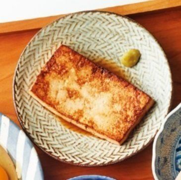 木綿豆腐1丁は厚みを4等分に切り、しょうゆ大さじ3をからめて5分おく。フライパンにサラダ油大さじ½をひき、汁けをぬぐった豆腐を並べて中火にかける。両面に焼き色がついたら器に盛り、わさび適量を添える。