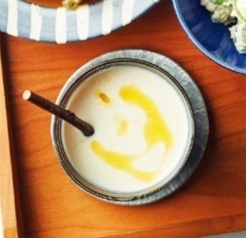 絹ごし豆腐1丁をボウルに入れて泡立て器(あればハンドミキサーだとなめらかに)でペースト状になるまでかき混ぜる。牛乳200ml、オリーブ油大さじ2、顆粒スープの素大さじ1/2、塩小さじ1/4を混ぜ、器に盛ってオリーブ油適量をたらす。