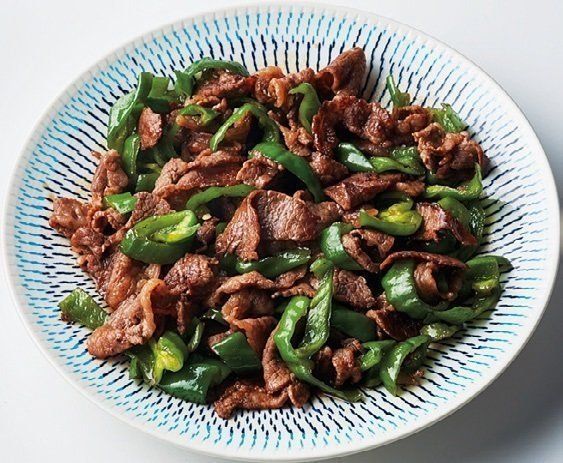 牛切り落とし肉200gを炒め、細切りにしたピーマン8個を加えてたれをからめる。