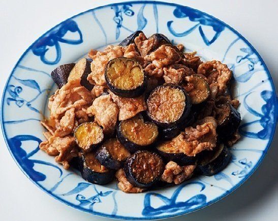 豚こま切れ肉300gを炒めて取り出し、なす4個の輪切りを蒸し炒めにして肉を戻し、たれを煮からめる。