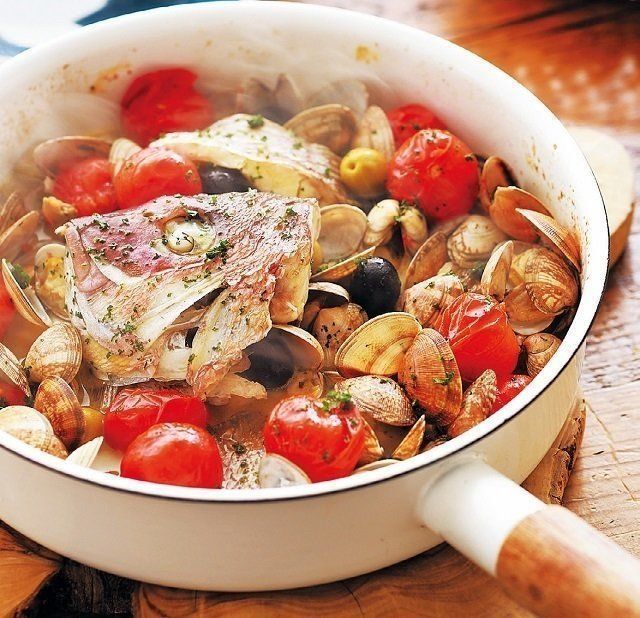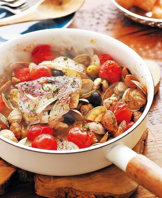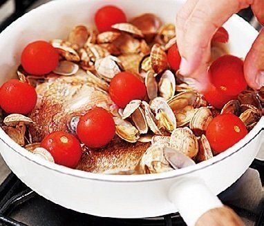 魚貝、トマト、オリーブ、にんにくといったうまみたっぷりの食材が仕事をしてくれるから、シンプルな作り方&味つけなのに、びっくりするほどおいしい一品。