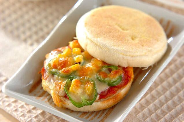 イングリッシュマフィンでピザ、という見た目も楽しい一品。ソーセージ、ピーマン、水煮コーンと色鮮やかで、バランスよく食べやすいのもうれしいところです。トースターでこんがり焼いて、サクサクとろとろをいただいちゃいましょう。