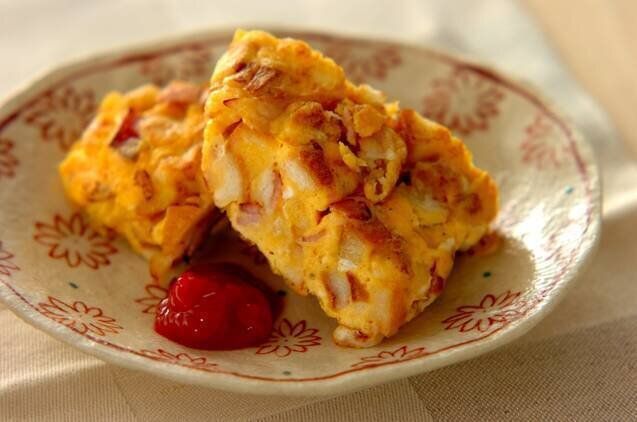 いつものオムレツに食パンの角切りを加えて、ボリューム満点にアレンジした一品。食パンは牛乳に浸しているので、しっとりとして食べやすいですよ。色合いも風味も相性バツグンの、ケチャップを添えて食べましょう。