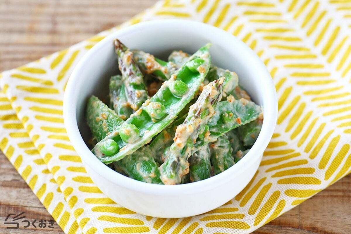 アスパラとスナップエンドウのシャキシャキ食感が楽しい、ごまマヨネーズあえレシピ。さっぱりとした味つけなので、朝ごはんにはもちろん、お弁当の彩りおかずにもぴったりです。好みでミニトマトをプラスして、サラダ感覚で食べても◎。